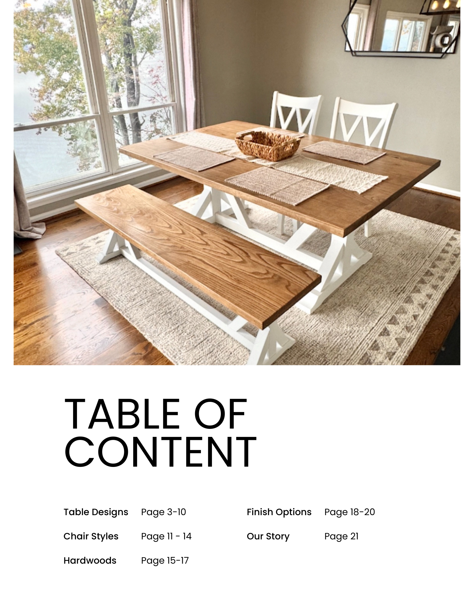 Here you can view our in-person design catalog we use with all our clients! Our catalog has our most popular table designs, chair prices, wood and finish options, etc. Please view our gallery to see fully completed projects we've done in the past. Everything is fully custom to you and made to order!